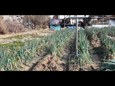 대형쇠스랑으로 찔러놓은 파 수확/오늘의 효자농기구입니다
